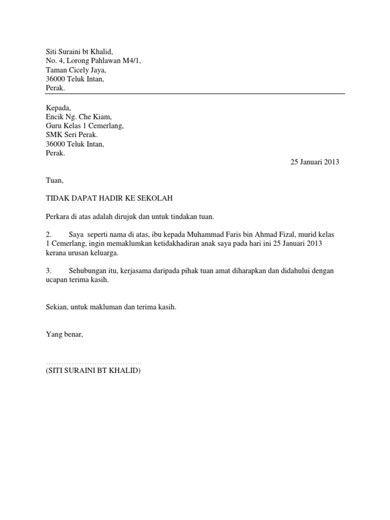Contoh Surat Rasmi Tidak Hadir Ke Sekolah Sakit Urusan Keluarga from www.permohonan.my Contoh surat tersebut digunakan untuk anak sekolah kelas 1, 2, 3, 4, 5, atau 6 untuk sekolah dasar dan madrasah ibtidaiyah. So, sesiapa yang urgent perlukan idea untuk buat surat cuti tu boleh lah rujuk contoh di bawah, just edit sikit sikit je ok? Sebagai ibubapa, kita hendaklah peka dengan kehadiran anak ke sekolah. Tutorial menulis.latin /tegak bersambung.menulis classic.menulis dan menggambar kali ini menulis contoh surat izin anak sekolah supaya belajar rapi dalam. Saya ishak bin alang bapa kepada nor amira binti ishak dari tingkatan 6a2 ingin memberitahu bahawa anak saya tidak dapat hadir ke sekolah pada 14 jun 2009 kerana harus menghadiri ujian kelayakan jpj untuk. Surat tak hadir ke sekolah atas urusan keluarga. Hal ini sendiri merupakan kewajiban dan etiket bagi karyawan yang tidak dapat bekerja sebagaimana semestinya. Pada waktu yang bersamaan, anak kedua saya juga akan masuk ke jenjang sekolah menengah.