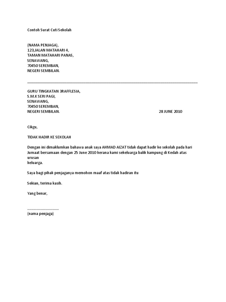 Sebagai ibubapa, kita hendaklah peka dengan kehadiran anak ke sekolah. Contoh surat mohon cuti ni penting, ya dak? Saya ishak bin alang bapa kepada nor amira binti ishak dari tingkatan 6a2 ingin memberitahu bahawa anak saya tidak dapat hadir ke sekolah pada 14 jun 2009 kerana harus menghadiri ujian kelayakan jpj untuk mendapatkan lesen motosikal. Savesave contoh surat memohon cuti sekolah for later. Disebut surat pribadi karena ditulis perseorangan dan dinas karena.